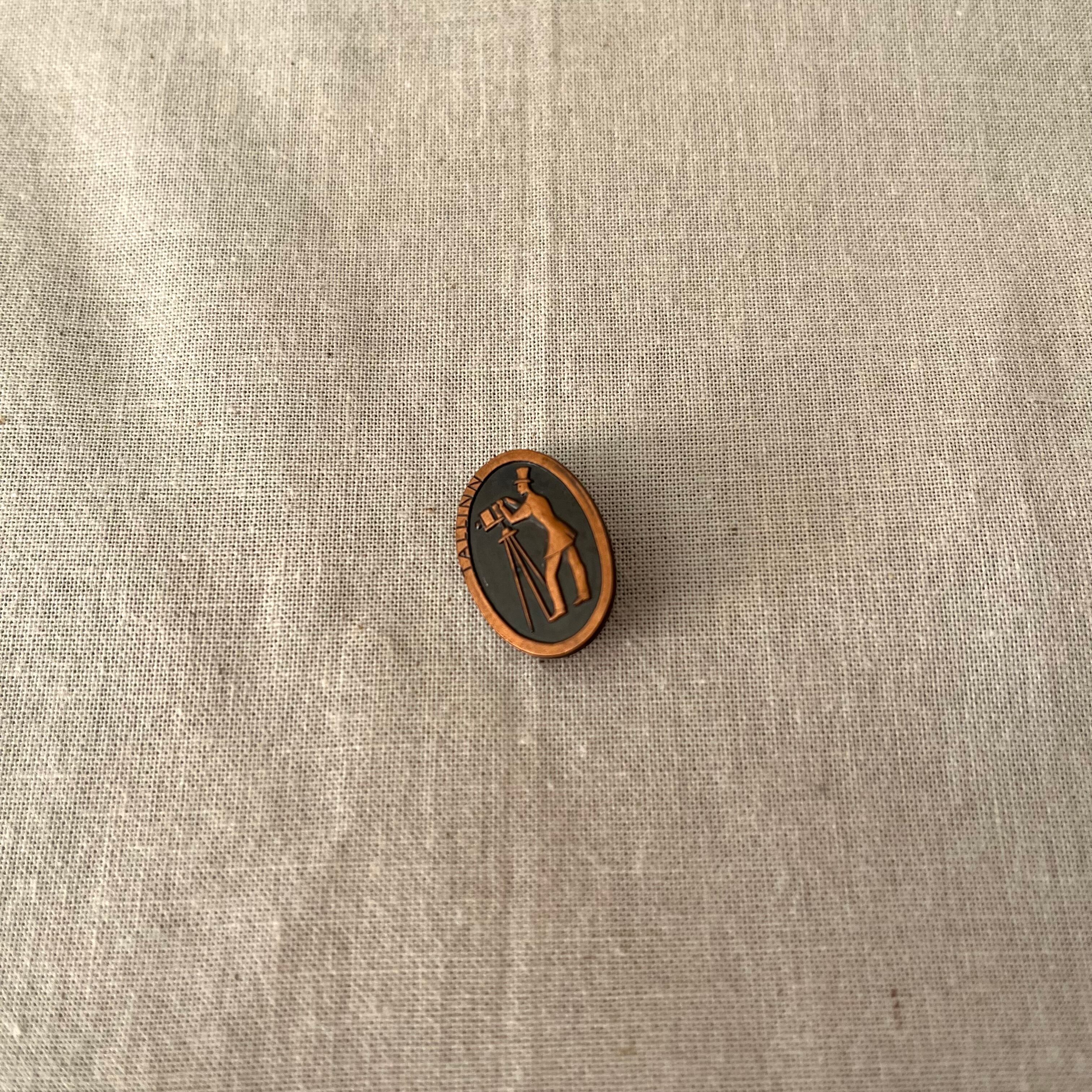 オーバル型の中に、昔ながらの三脚付きカメラで撮影をする男性の姿が描かれています。艶消しのゴールドとチャコールグレーの落ち着いた色合いが、どこかノスタルジックでシックな印象を与えてくれます。